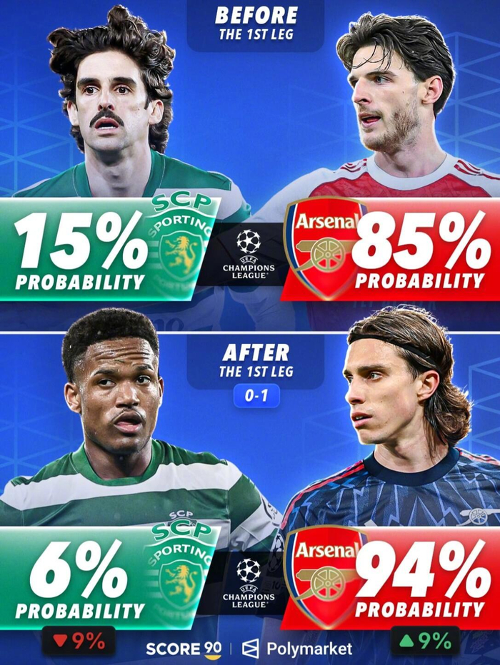 #欧冠[超话]# 欧冠淘汰赛首回合战罢,相关预测平台也更新了各队的晋级概率。根据Score90援引Polymarket给出的最新数据,拜仁和阿森纳都在首回合赢球后进一步占据晋级主动。